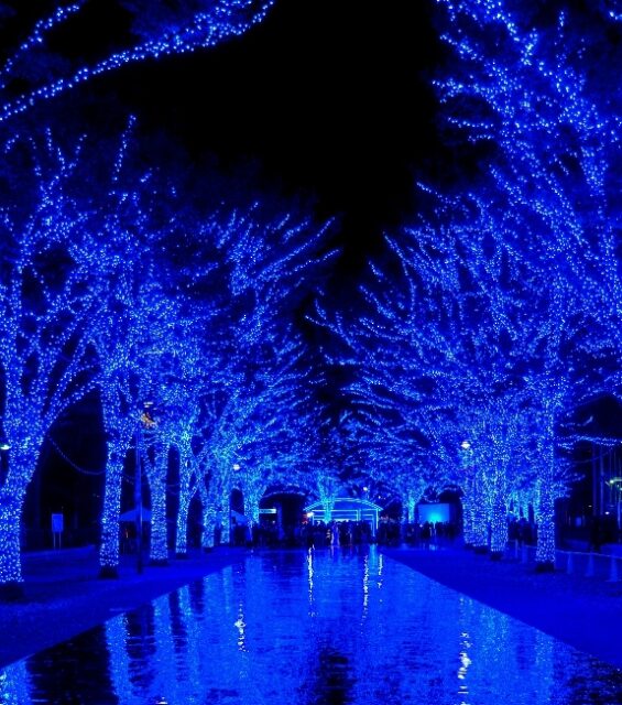 約60万球の光が作り出す“青いトンネル”は、息をのむ美しさ。公園の並木道が非日常的な空間に変わり、どこを切り取っても写真映えすること間違いなしです。