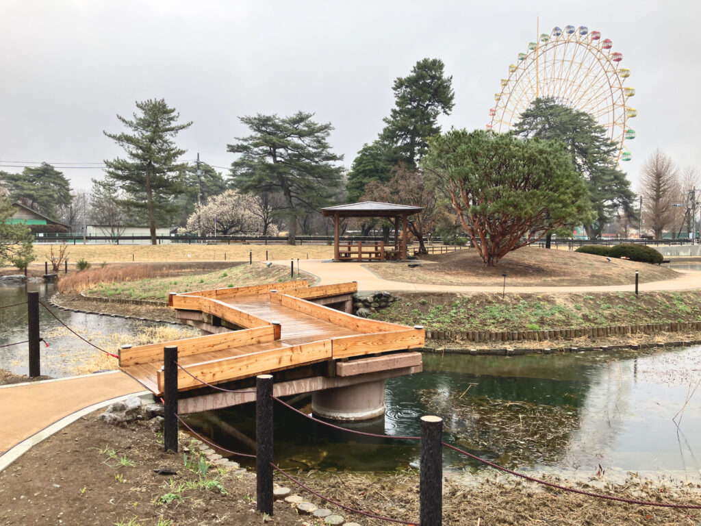 新しいカフェとバリアフリー化されたスロープや四阿の向こうには、昔から変わらず回り続ける遊園地の観覧車が見える。