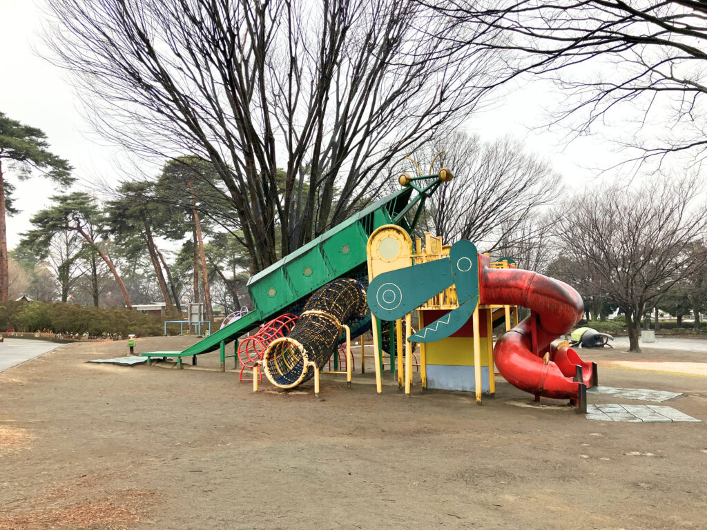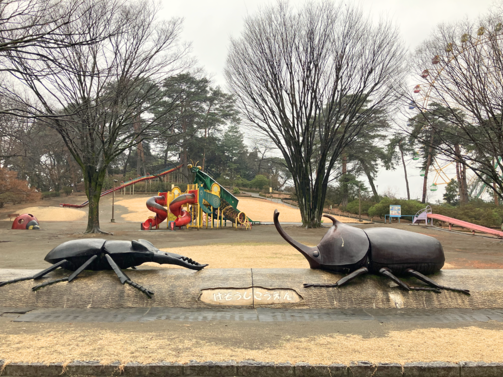 公園の方に行くとパッと目に入るのは昆虫の遊具たち。大きなカマキリの遊具から、クワガタとカブトムシのオブジェまで。
