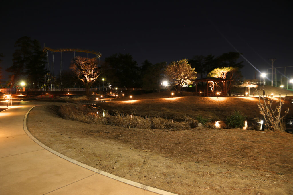 これまでの華蔵寺公園は、夕方になると静まり返る昔ながらの公園でした。しかし今回、水生植物園の遊歩道には夜間ライトアップ照明が設置され、水面をやさしく照らす幻想的な景色が広がるようになったんです。