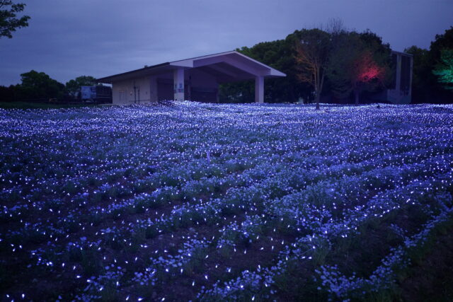 特筆すべきは、ライトアップの色調です。ネモフィラの花が夜でも美しく見えるよう、明度や彩度を緻密に計算したオリジナルのネモフィラブルーを使用。地上の青と夜空が一体化するような没入感は、まさに圧巻の一言です。