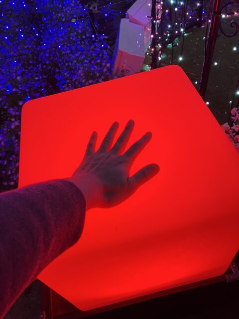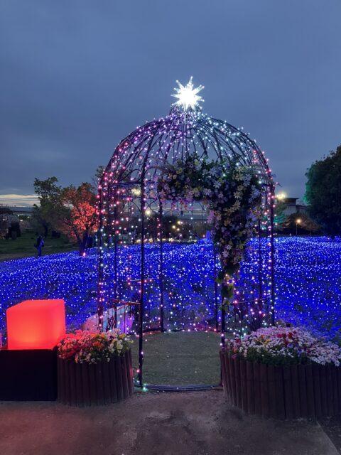 - ドームパーゴラ:手前のスイッチを押すと、光の色がランダムに変わる参加型の仕掛け。推しキャラのグッズやペットと一緒に撮影するのにも最適なスポットです。