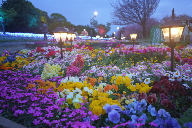 公園に一歩踏み入れた瞬間に、春を感じさせる花壇と華やかなライトアップがイベント全体へのワクワク感を高めてくれます。