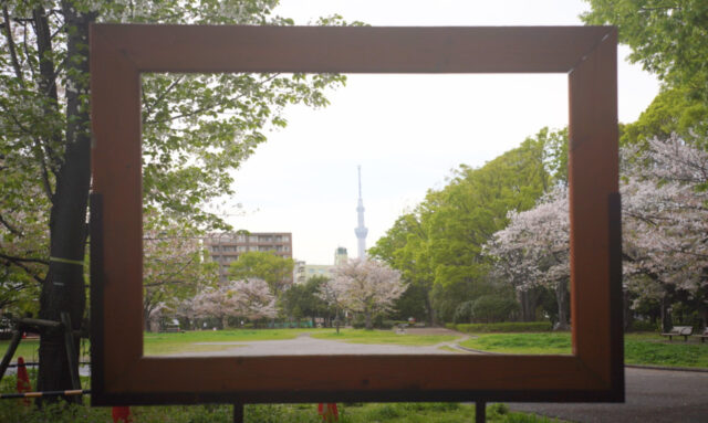あります。取材時は桜が散り始めていましたが、満開の時期なら額縁の中がピンク色に染まる絶景が見られたはず……!と、少し後悔しました。ただ、これからの季節は爽やかな緑とスカイツリーのコラボを見ることができますね。
