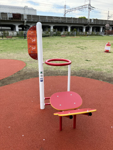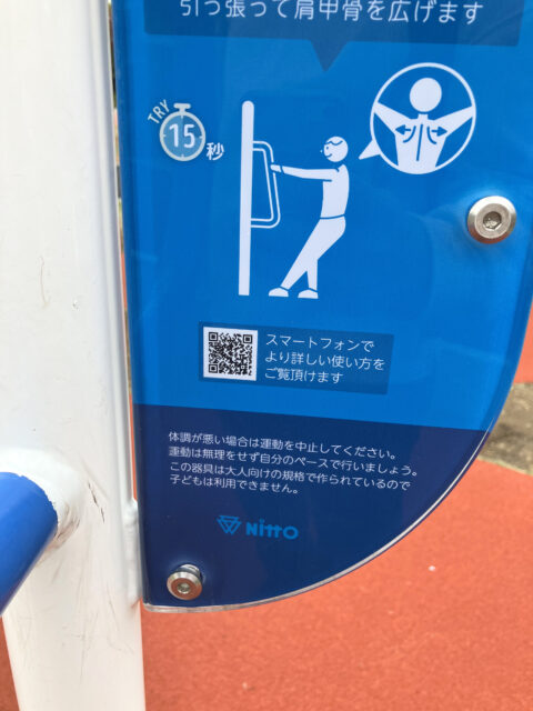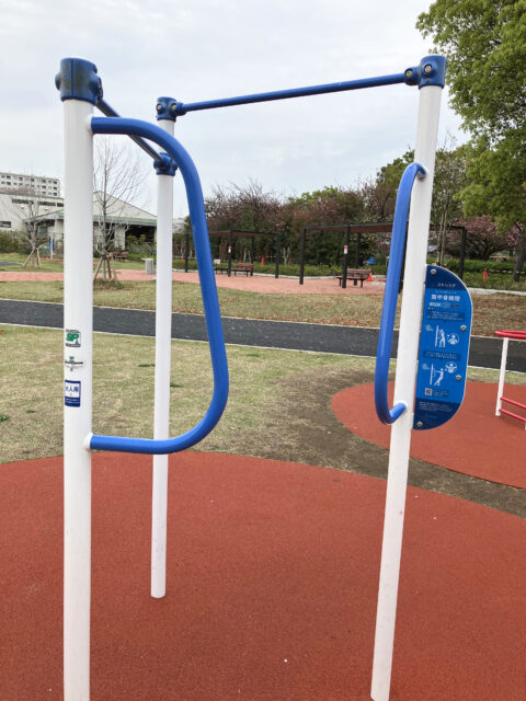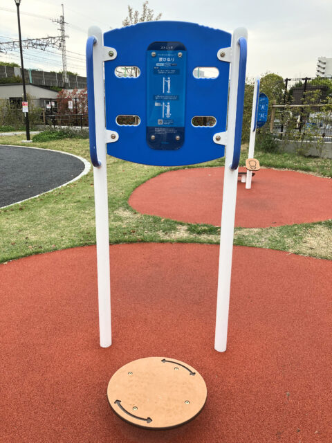 アートや絵本以外にも個人的にいいなと思ったのが、新しく整備された芝生広場にある健康遊具です。ゴムチップ舗装の上に清潔感のある遊具が配置されていて、一つひとつに詳しい使い方が書かれています。