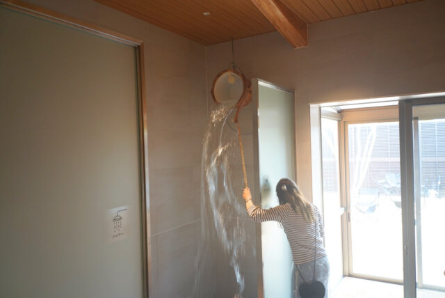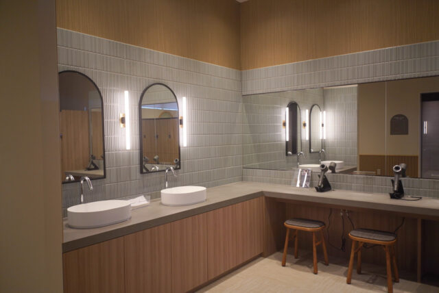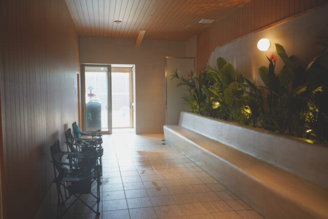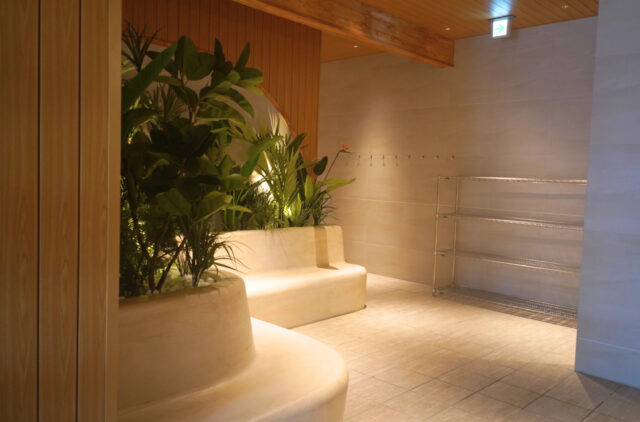 - 地元の素材を使った木の温もり: 茨城県産の八溝材という杉を使用。 更衣室は木材、タイル、金属をミックスしたニコアンドらしいモダンな内装は、視覚からも癒しを与えてくれます。