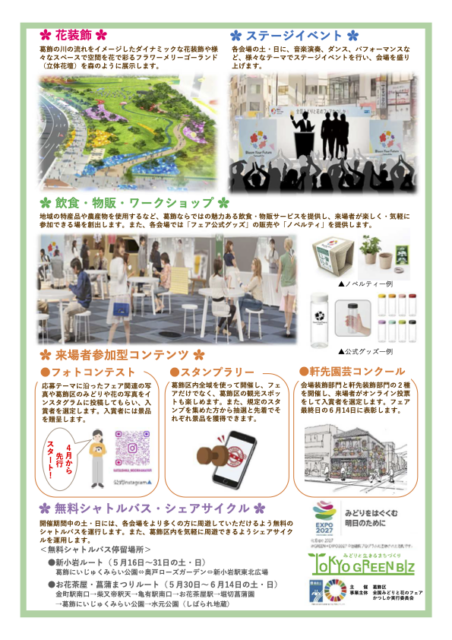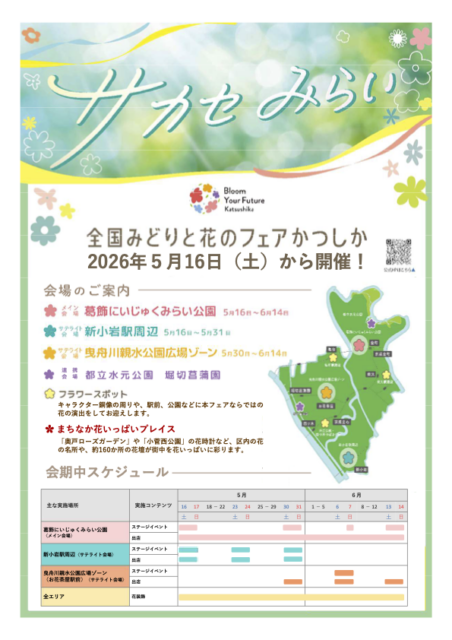 | 開催場所 | メイン会場:葛飾にいじゅくみらい公園 サテライト会場:新小岩駅周辺 サテライト会場:曳舟川親水公園広場ゾーン 連携会場:都立水元公園 堀切菖蒲園 |
