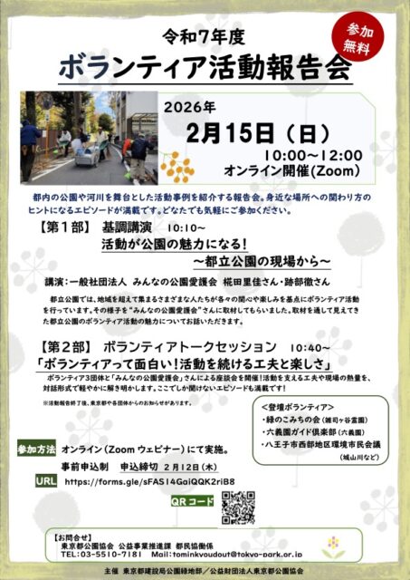 令和7年度ボランティア活動報告会 開催日時 2026年2月15日 10:00~12:00 開催場所 オンライン(Zoom) 参加費 無料 参加申込 事前申込制(2/12締切) こちらのフォームよりお申し込みください。 主…