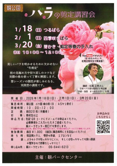 ▼▼ 全国の公園で開催されるイベント情報なら 無償で掲載できます▼▼ 情報のご提供はこちら 今後の イベント › 大阪府 イベント Search and Views Navigation Show イベント Search イベント Search イベント From 検索 イベント Views Navigation 以下の形式で表示 リスト月日 « 前のイベント 2026年1月 バラの剪定講習会 1月18日 - 3月20日 靱公園, 西区 大阪市, 大阪府 バラの剪定講習会 開催日時 2026年1月18日、2月1日、3月20日 各10:00~12:00 開催公園 靱公園 開催場所 大阪府大阪市西区 参加費 有料 参加申込 必要 主催者 靱公園&地域デザイングループ(指定管理… さらに詳しく » + Export Events 都道府県からイベントを探す 北海道 青森県 岩手県 宮城県 秋田県 山形県 福島県 茨城県 栃木県 群馬県 埼玉県 千葉県 東京都 神奈川県 新潟県 富山県 石川県 福井県 山梨県 長野県 岐阜県 静岡県 愛知県 三重県 滋賀県 京都府 大阪府 兵庫県 奈良県 和歌山県 鳥取県 島根県 岡山県 広島県 山口県 徳島県 香川県 愛媛県 高知県 福岡県 佐賀県 長崎県 熊本県 大分県 宮崎県 鹿児島県 沖縄県